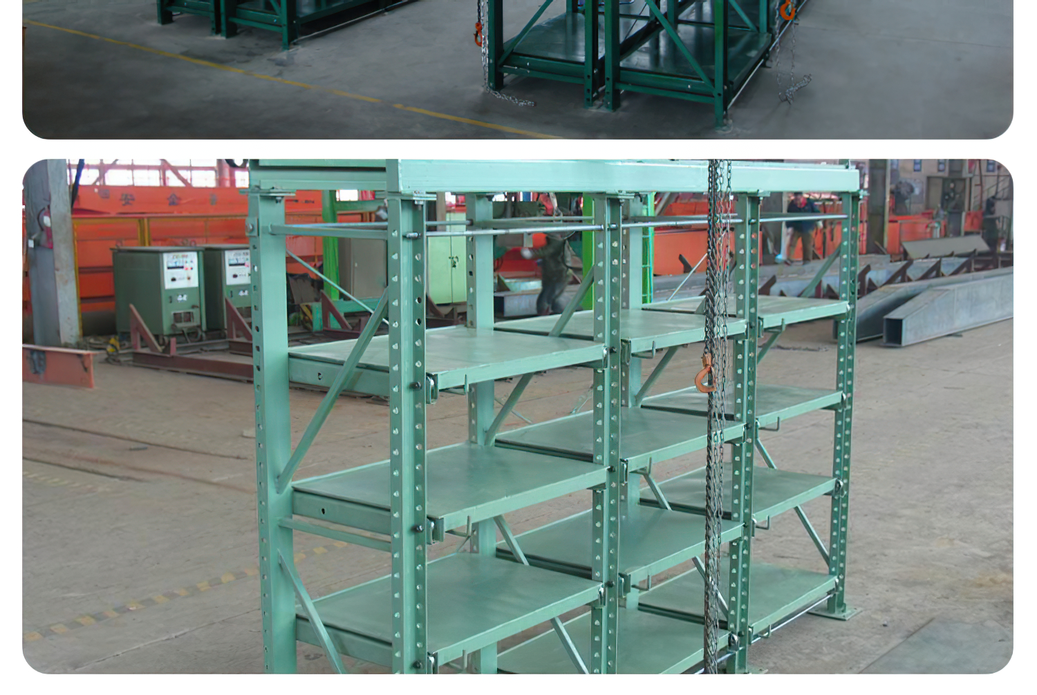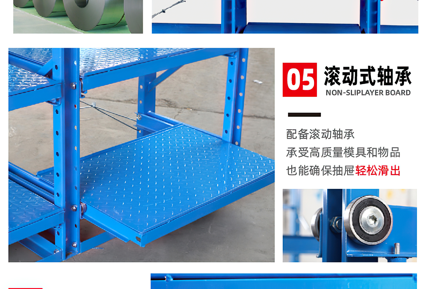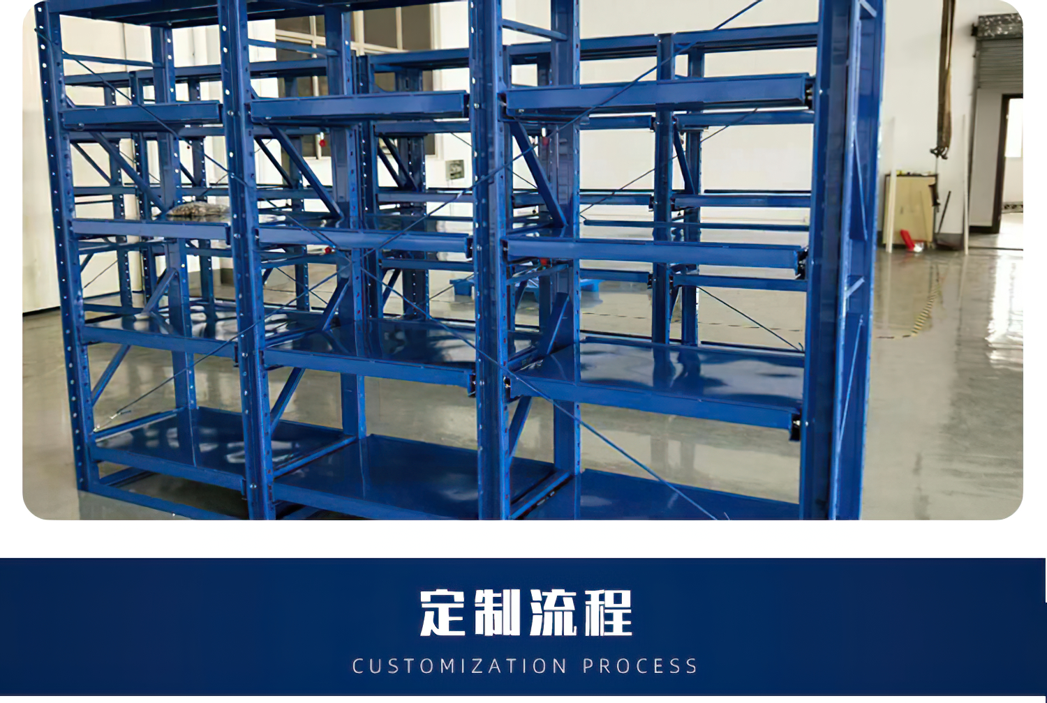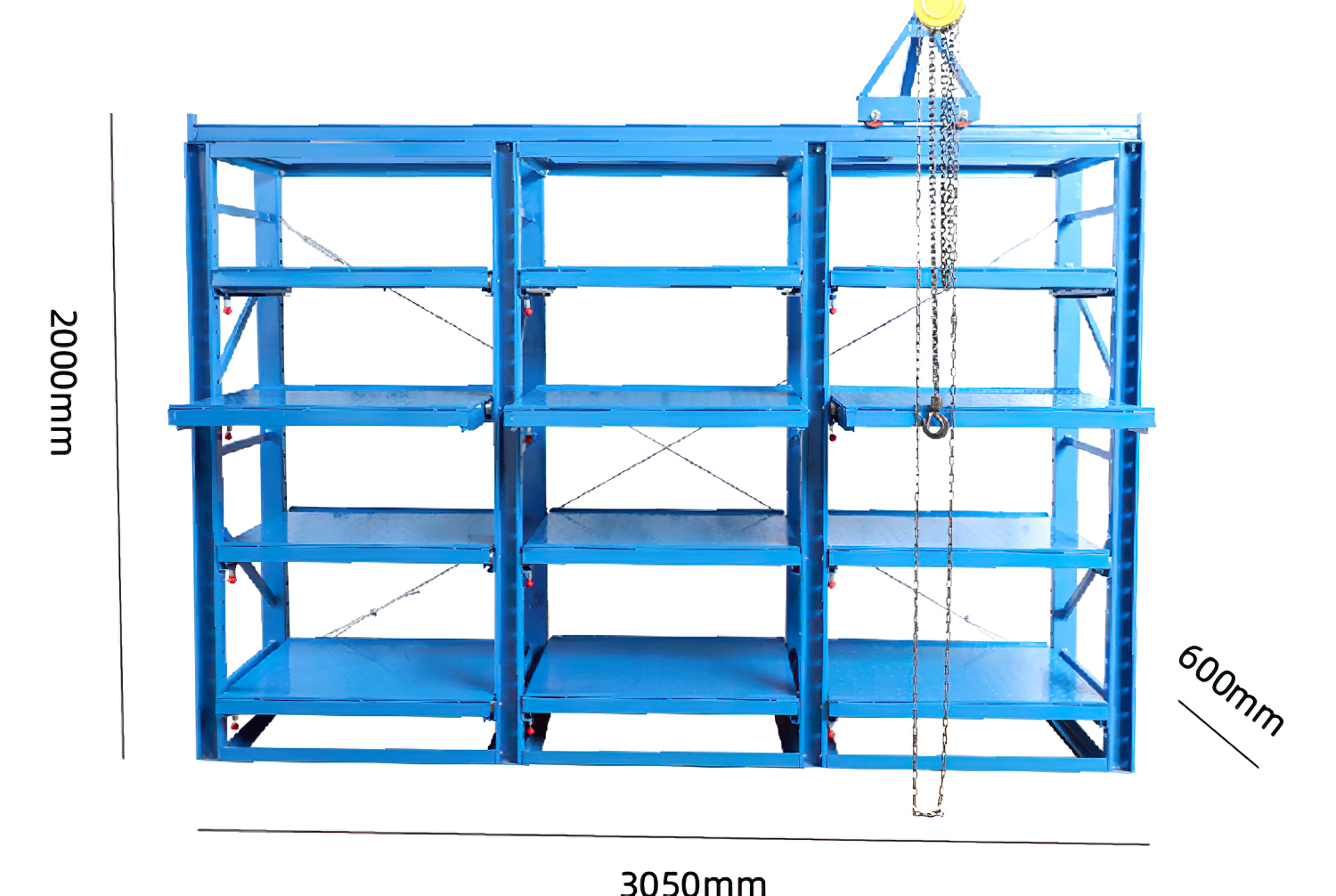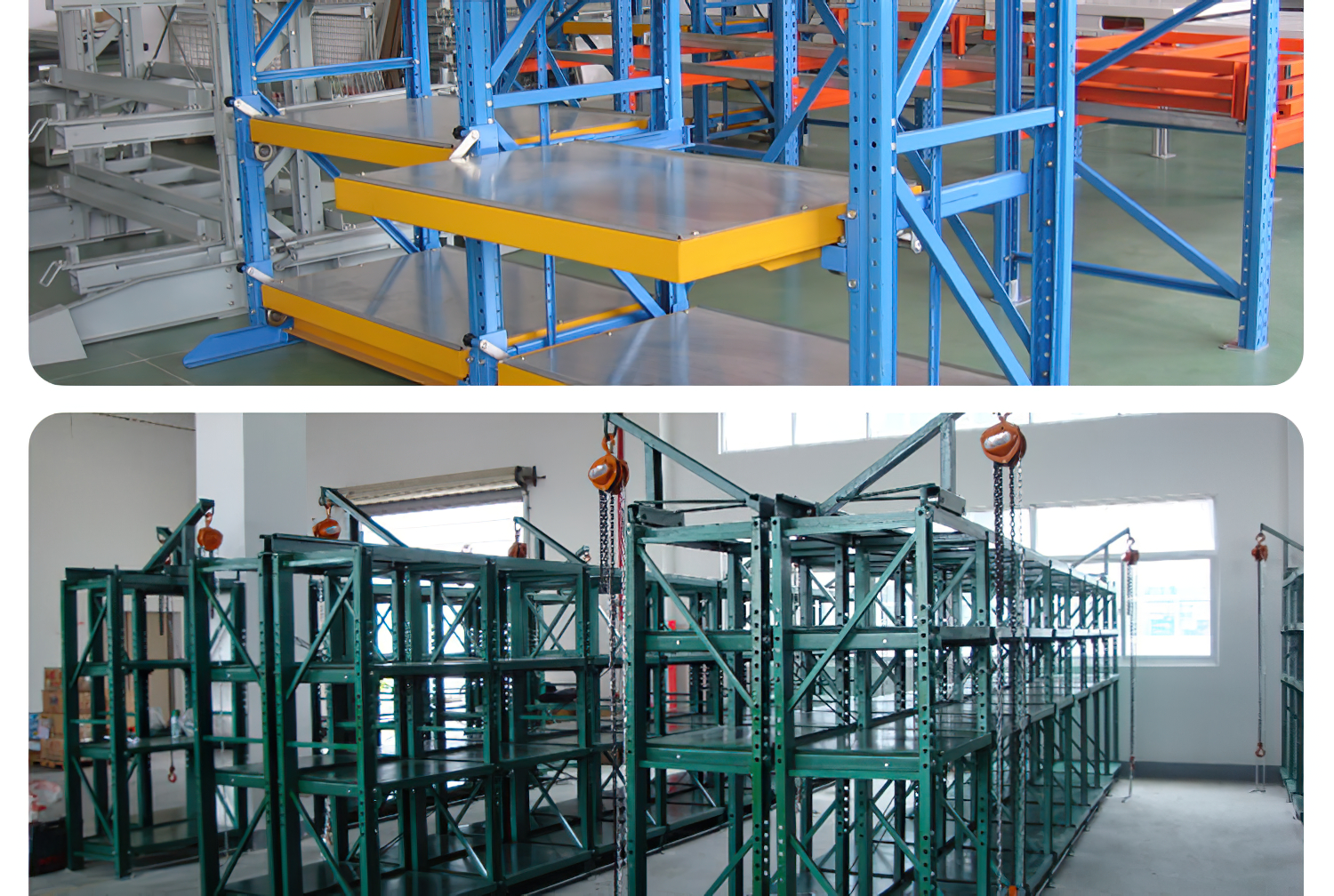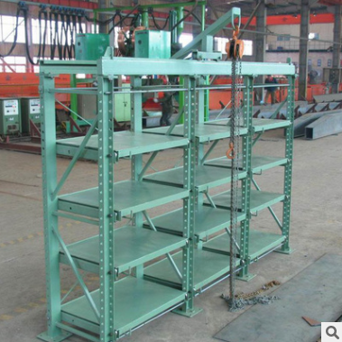 抽屜式貨架通常用于存放模具等重物,無需叉車,頂部可配置移動葫蘆車(手拉或電動),可實現(xiàn)模具的起吊,抽屜板底部都設(shè)有滾輪軌道,抽屜板承載后仍能自由的拉動,附加定位保險裝置。滾輪軌道是用模具一體成型,精度極高,有極高裝配精度,所以滾輪使用壽命大大延長并且使用時拉出或推入很省力。貨架高度一般在2.5m以下,除頂層外均可設(shè)計制作成抽屜式結(jié)構(gòu),可輕松抽出1000kg/層以內(nèi)的重物,輔之以行車或吊葫蘆,輕松實現(xiàn)貨物的存取作業(yè)。