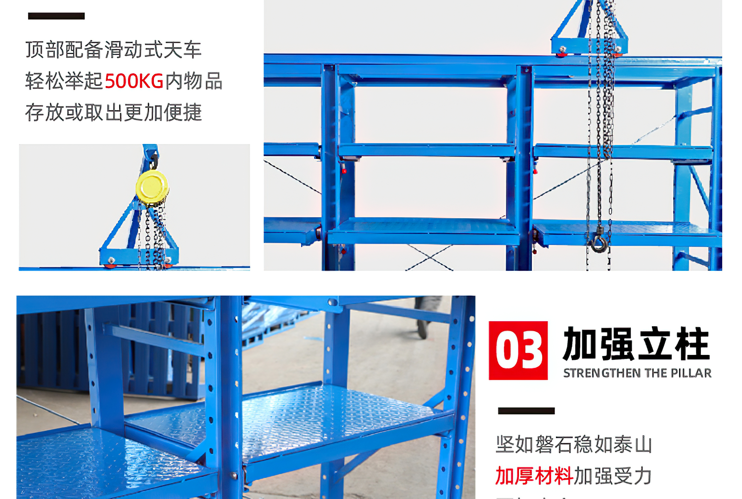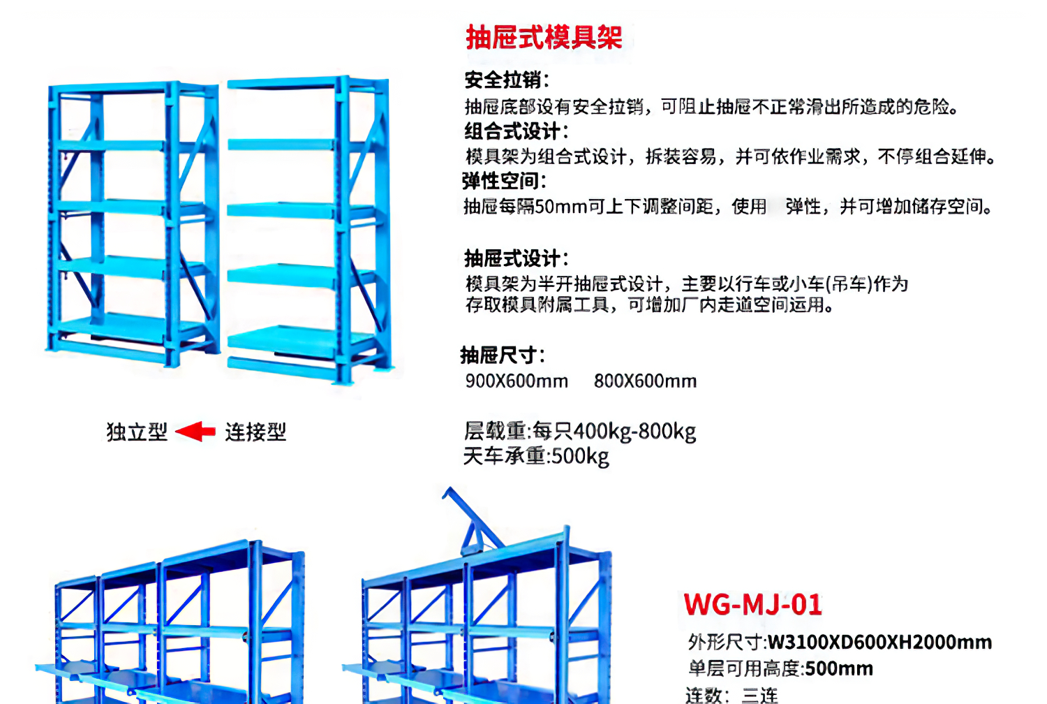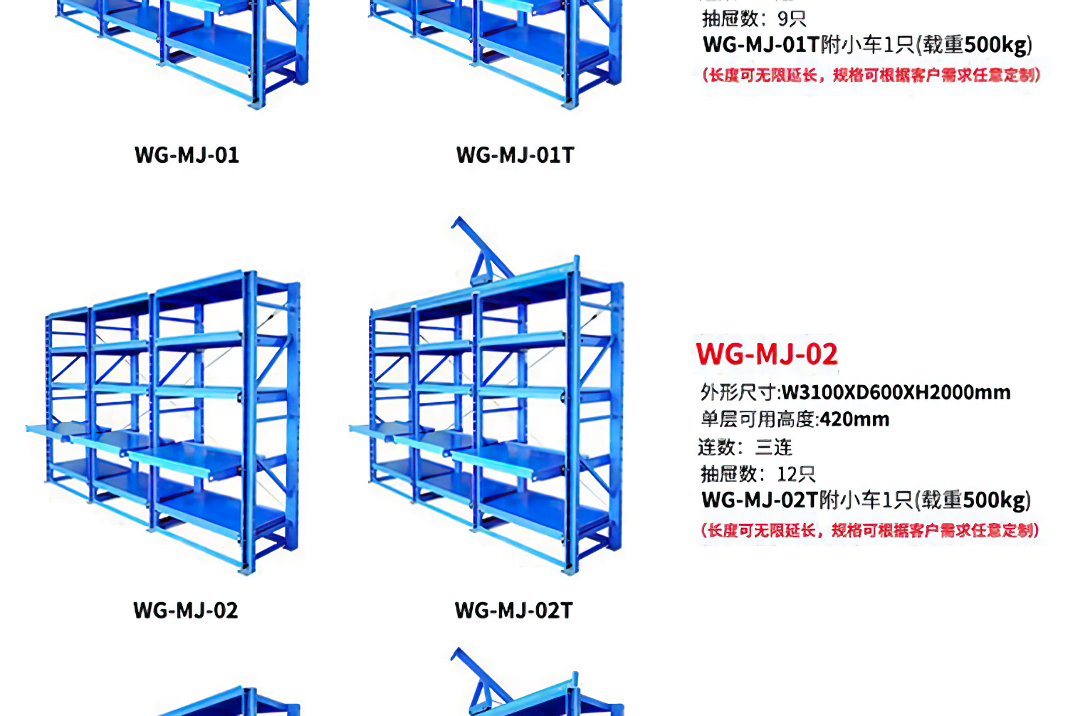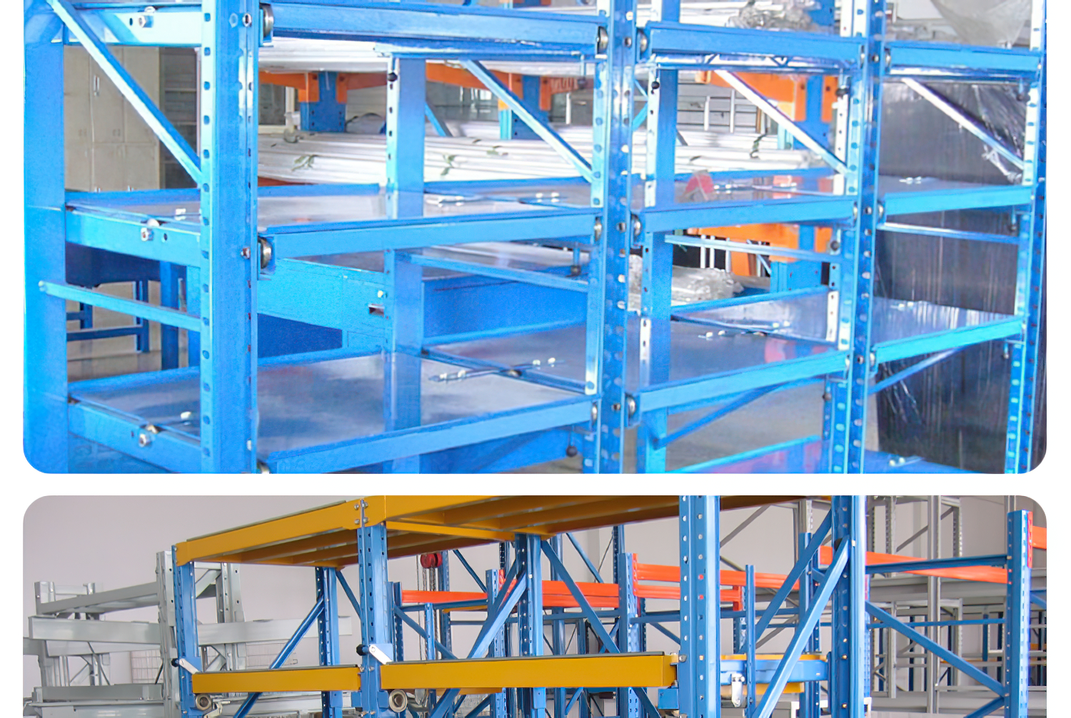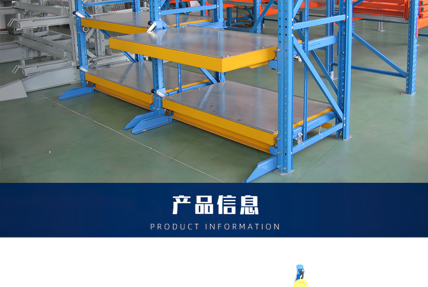 抽屜式貨架通常用于存放模具等重物,無需叉車,頂部可配置移動葫蘆車(手拉或電動),可實現(xiàn)模具的起吊,抽屜板底部都設(shè)有滾輪軌道,抽屜板承載后仍能自由的拉動,附加定位保險裝置。滾輪軌道是用模具一體成型,精度極高,有極高裝配精度,所以滾輪使用壽命大大延長并且使用時拉出或推入很省力。貨架高度一般在2.5m以下,除頂層外均可設(shè)計制作成抽屜式結(jié)構(gòu),可輕松抽出1000kg/層以內(nèi)的重物,輔之以行車或吊葫蘆,輕松實現(xiàn)貨物的存取作業(yè)。