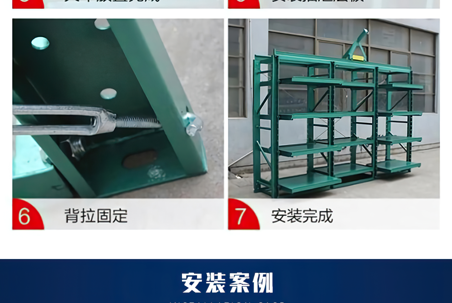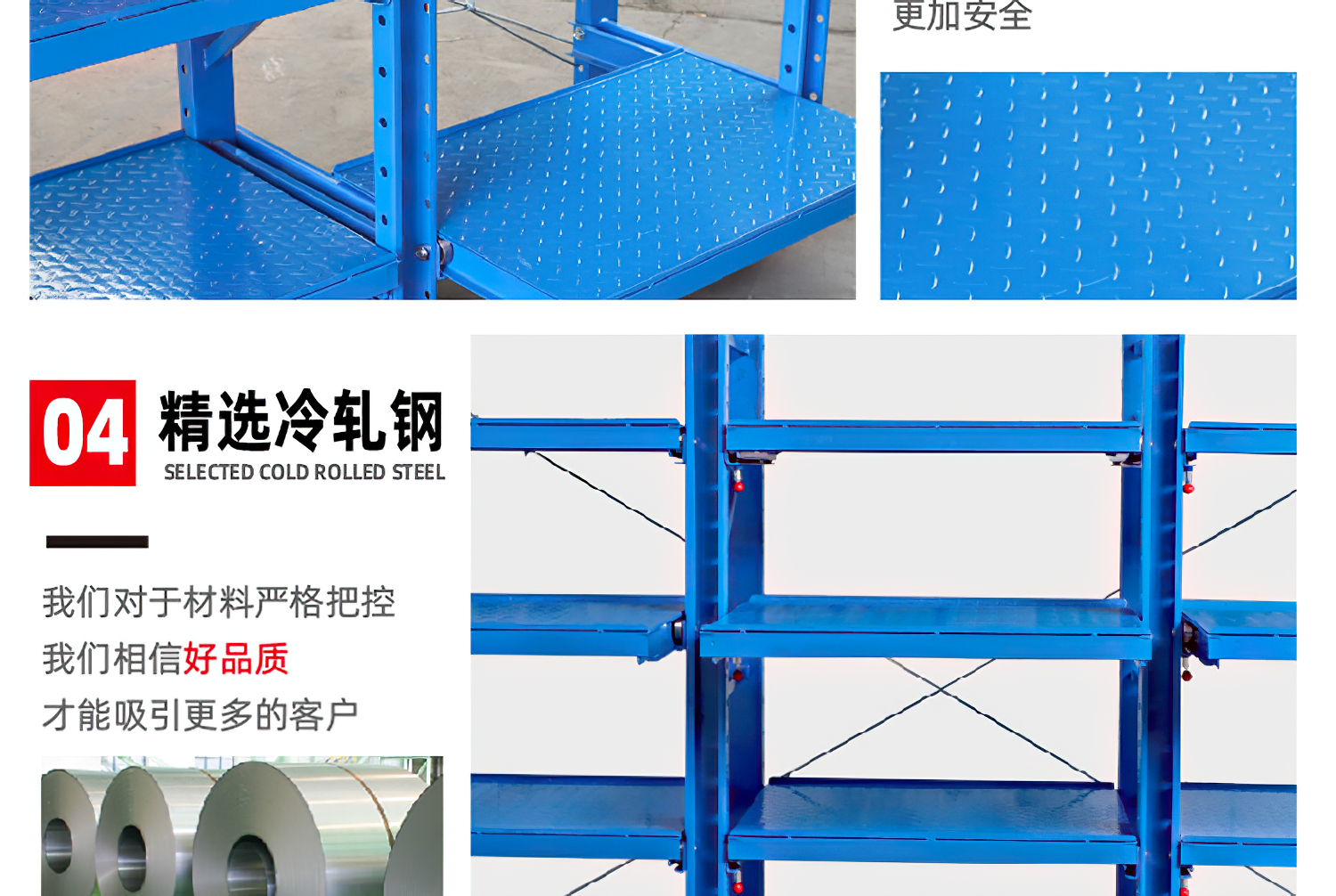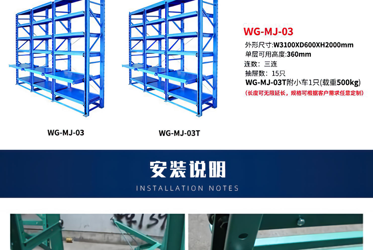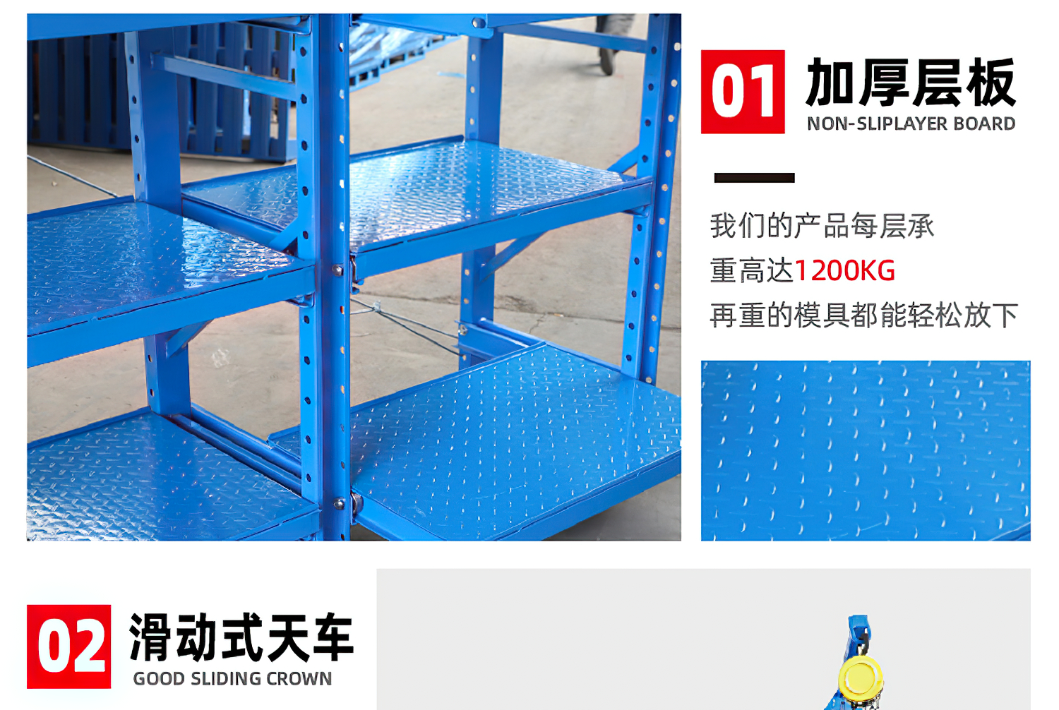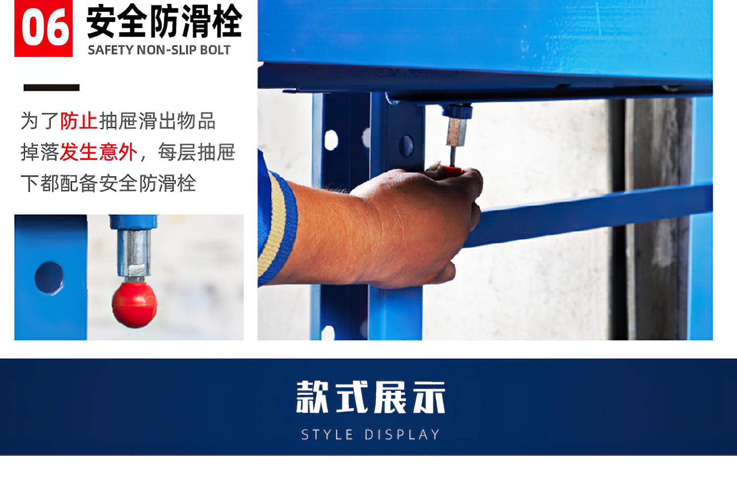 抽屜式貨架通常用于存放模具等重物,無需叉車,頂部可配置移動葫蘆車(手拉或電動),可實現(xiàn)模具的起吊,抽屜板底部都設(shè)有滾輪軌道,抽屜板承載后仍能自由的拉動,附加定位保險裝置。滾輪軌道是用模具一體成型,精度極高,有極高裝配精度,所以滾輪使用壽命大大延長并且使用時拉出或推入很省力。貨架高度一般在2.5m以下,除頂層外均可設(shè)計制作成抽屜式結(jié)構(gòu),可輕松抽出1000kg/層以內(nèi)的重物,輔之以行車或吊葫蘆,輕松實現(xiàn)貨物的存取作業(yè)。