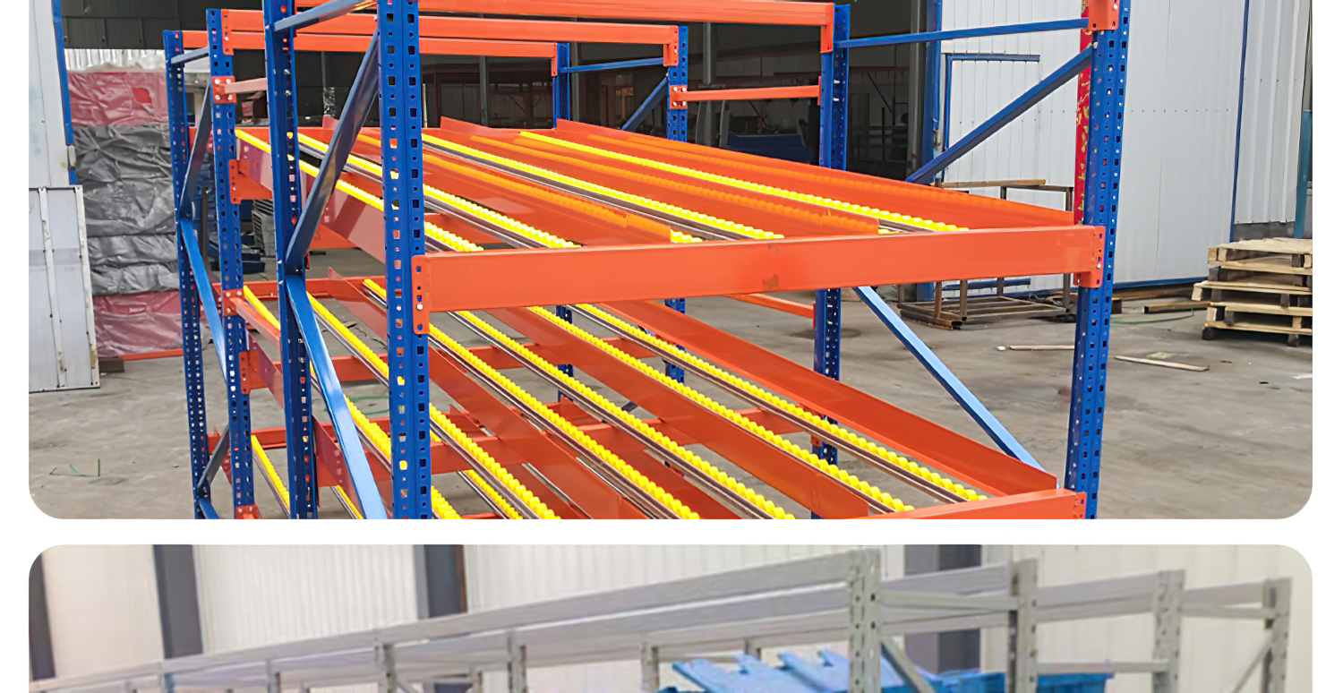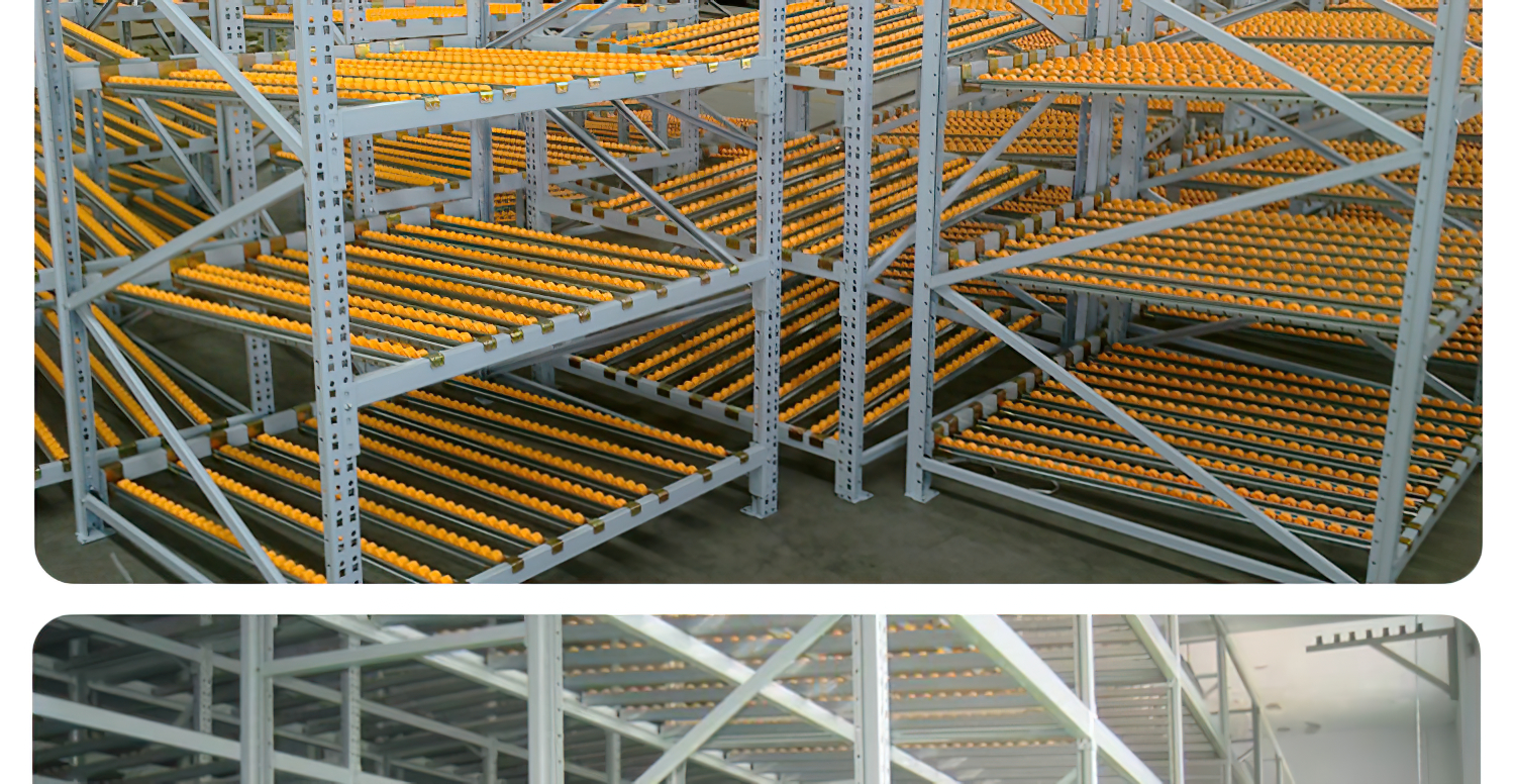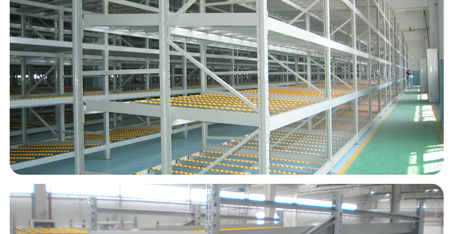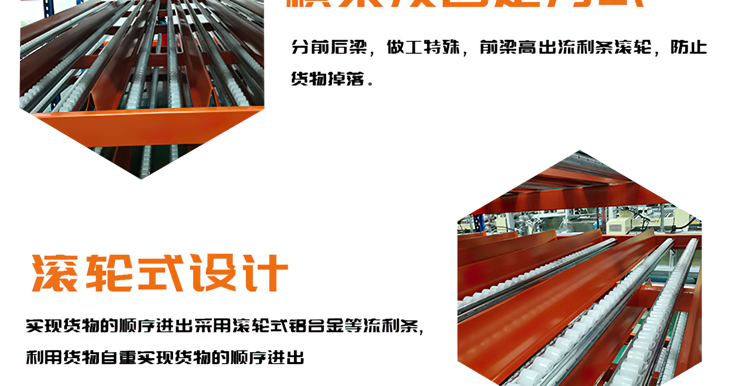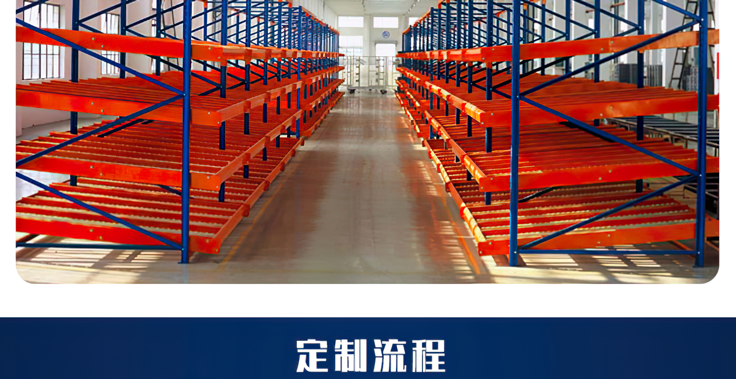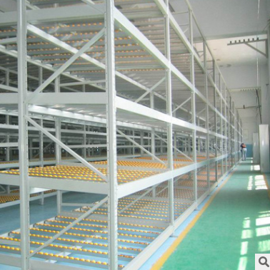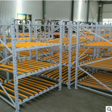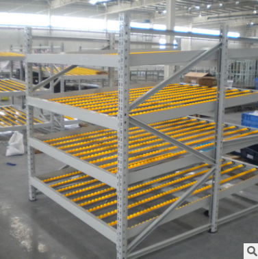 流利式貨架的流利條直接連接到前后橫梁及中間支撐梁上,橫梁直接掛在支柱上,流利條安裝傾斜度取決于貨箱的尺寸、重量以及流利架的深度,通常取5%~9%。流利條滾輪的承載力為6kg/只,當(dāng)貨物較重時,可以在一個滾道安裝3-4根流利條。通常在深度方向上每隔0.6m安裝一根支撐梁以增加流利條的剛度。當(dāng)滾道較長時,可用分隔板將滾道隔開。取貨端需安裝制動片使貨物減速,降低沖擊。